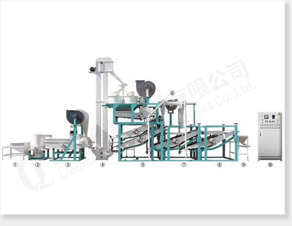 input hopper ② spiral elevator  multi-functional cleaner  bucket elevator main part of the equipment(dehullers,air separator and seed-kernel separator)  pneumatic system of back-flowing materials  seed-kernel reseparator1   seed-kernel reseparator2 kernels bin  electric control cabinet