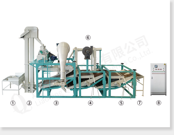 ① input hopper ② bucket elevator ③ main part of the equipment (dehuller,air separator and seed-kernel separator) ④ seed-kernel reseparator1 ⑤ seed-kernel reseparator2 ⑥ pneumatic system of back-flowing materials ⑦ kernels bin ⑧electric control cabinet