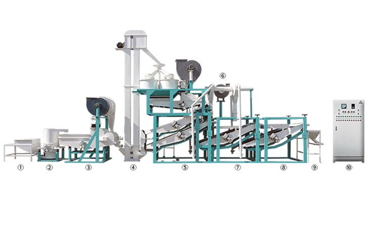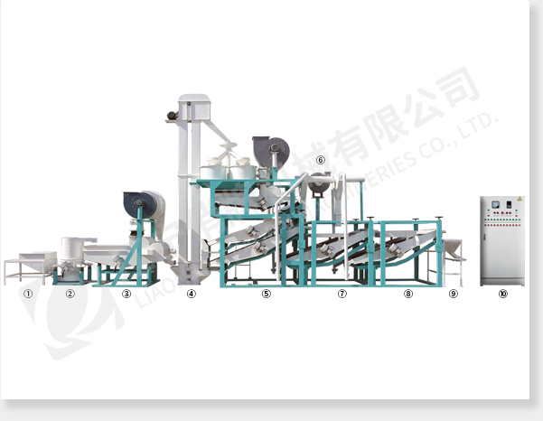 ① 上料斗② 原料提升機(jī) ③ 多功能除雜機(jī) ④ 斗式提升機(jī) ⑤ 脫殼、風(fēng)選、分選主機(jī) ⑥ 風(fēng)力回料系統(tǒng) ⑦ 籽仁復(fù)選機(jī)1 ⑧ 籽仁復(fù)選機(jī)2 ⑨ 接料斗 ⑩ 電氣控制柜