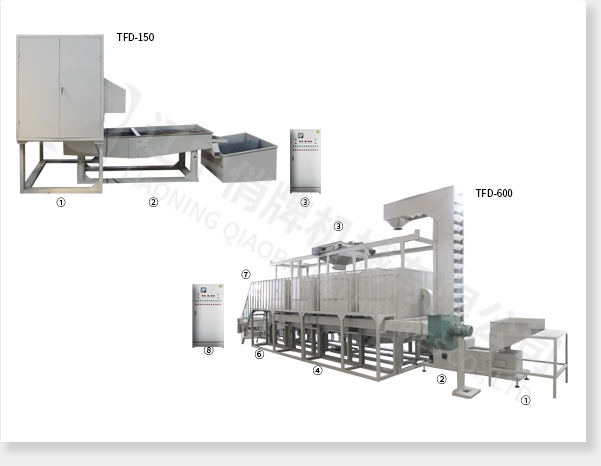 TFD-600型:① 上料斗 ② Z型提升機 ③ 喂料小車 ④ 脫皮機(4臺) ⑤ 送料篩(2臺) ⑥ 除糠篩和分選篩 ⑦ 排塵系統(tǒng) ⑧ 電氣控制柜